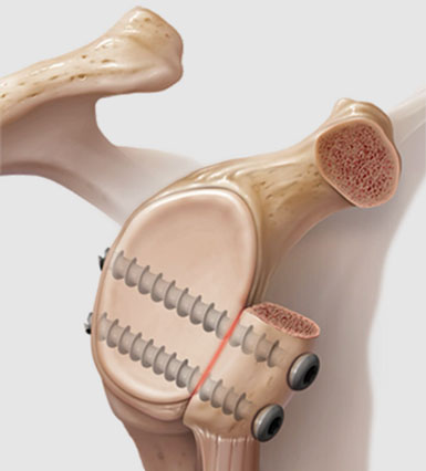 Na cirurgia de Latarjet, retiramos um pequeno fragmento do osso coracoide (localizado na escápula) e o transferimos para a parte anterior da glenóide, fixando-o com parafusos específicos.